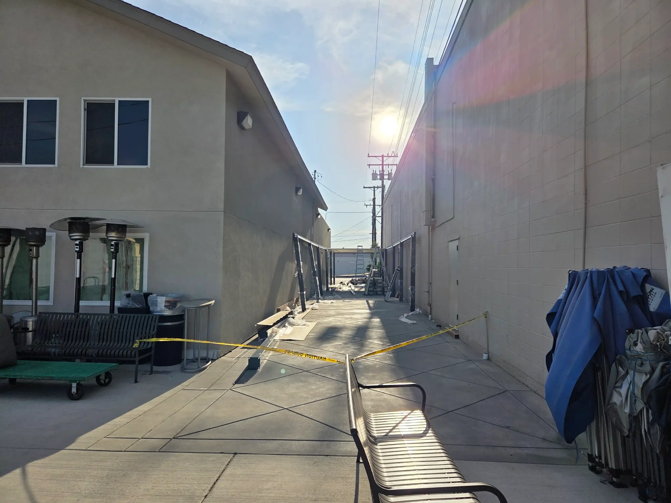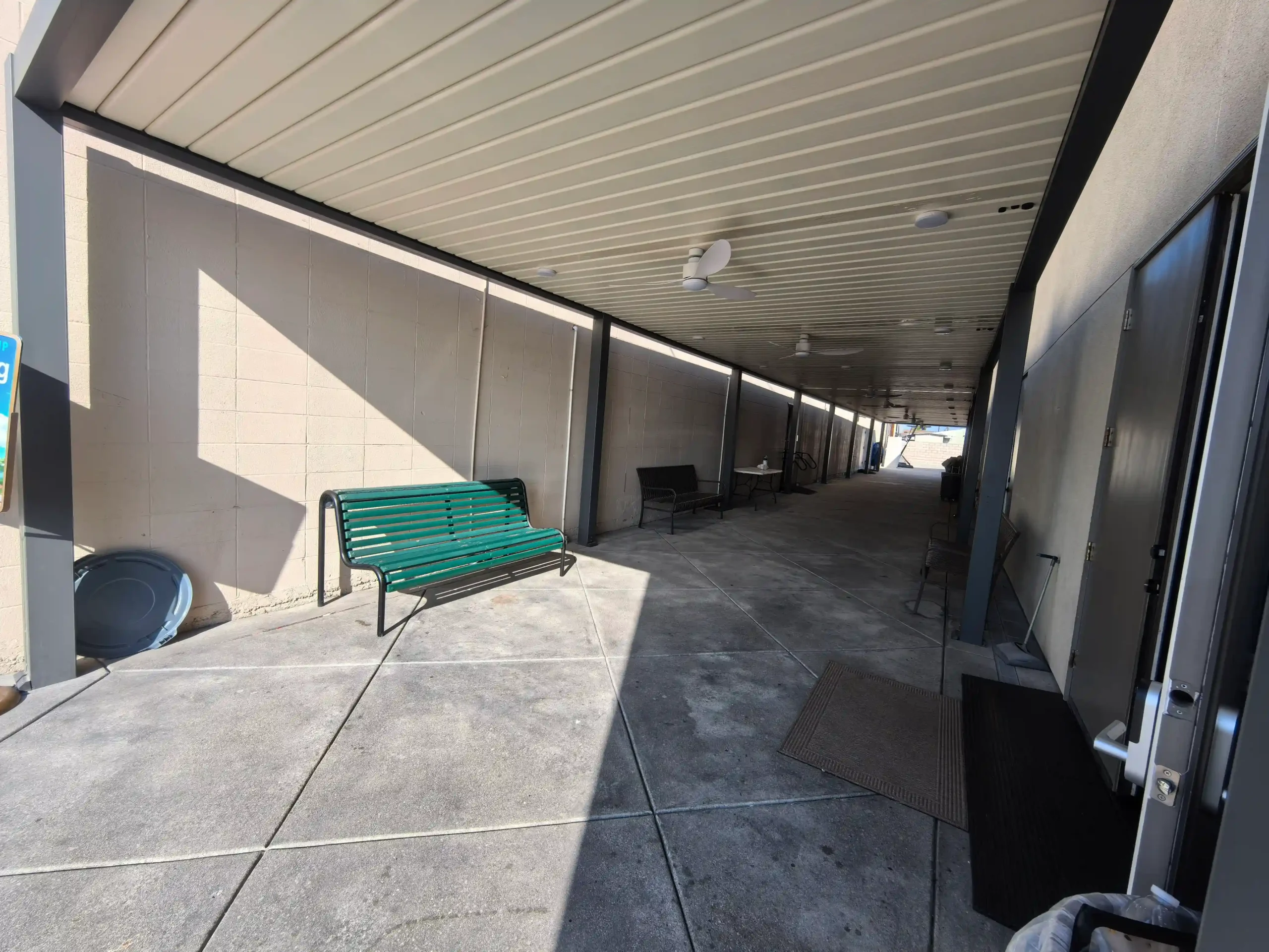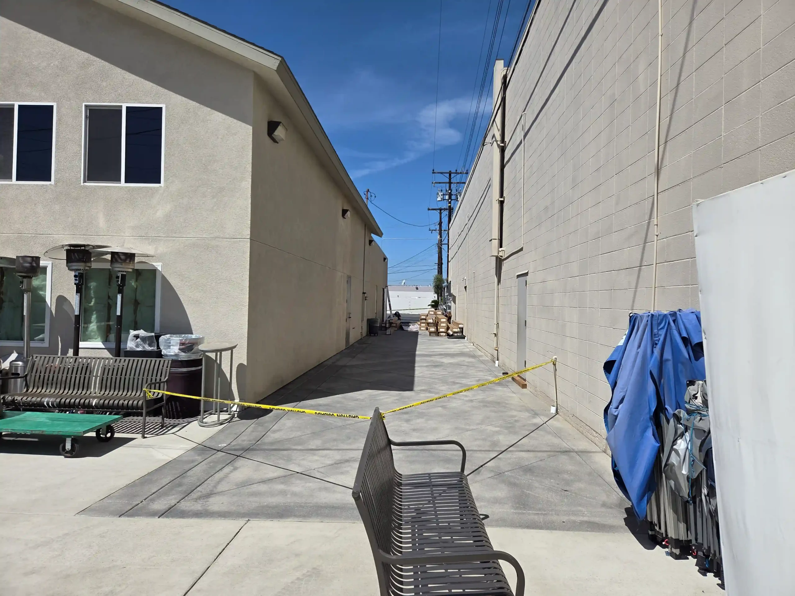 The 100-foot open walkway between church buildings is fully exposed to intense LA sun. With no shade, it becomes extremely hot and uncomfortable for pedestrians, leaving no room for people to stop or gather.