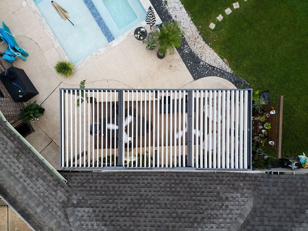 The custom pergola features white louvers that let the family control sunlight and shade with ease. Close the louvers for full coverage from the Texas sun, or open them partially to let in natural light—no more patchy shade from flimsy umbrellas.