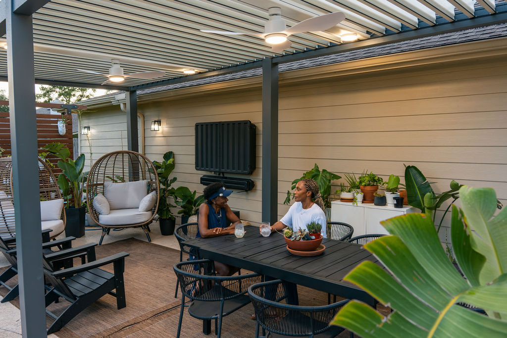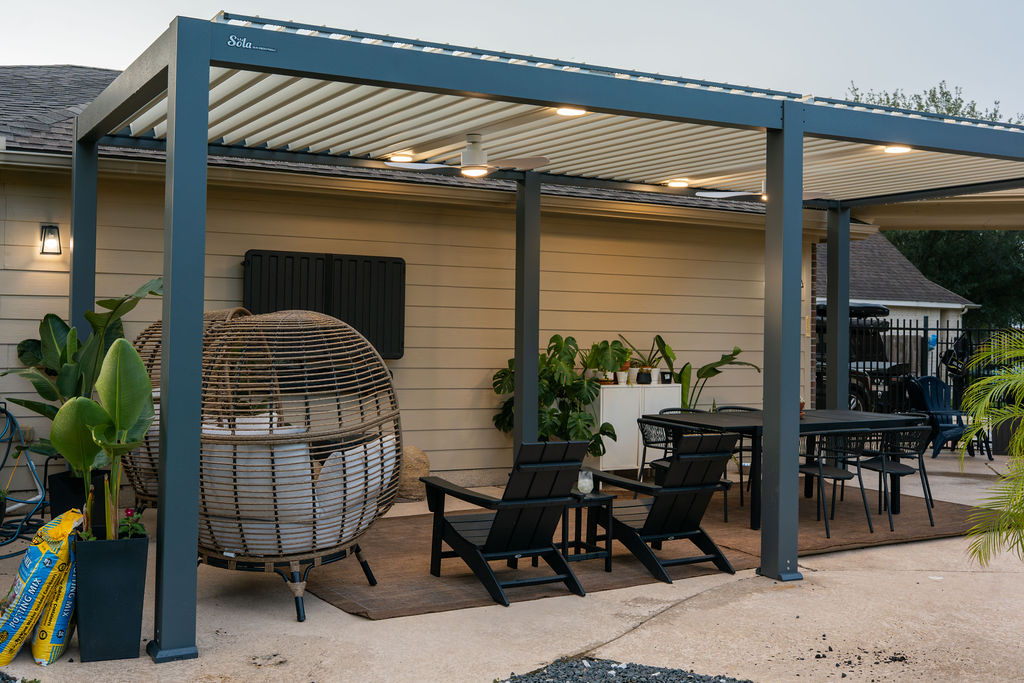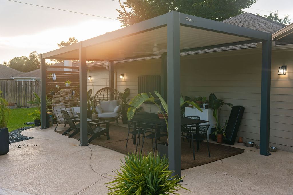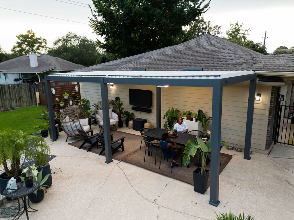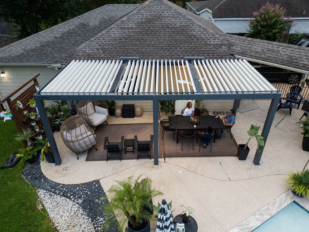 "OUR CUSTOM LOUVERED ROOF PERGOLA COMPLETELY CHANGED HOW WE USE OUR HOME. WE HOST GATHERINGS AND RELAX OUTSIDE DAILY—NO MORE HIDING FROM THE SUN OR FEELING EXPOSED. FANS KEEP US COOL, LIGHTS MAKE EVENINGS MAGICAL, AND IT HOLDS UP IN WIND AND RAIN."