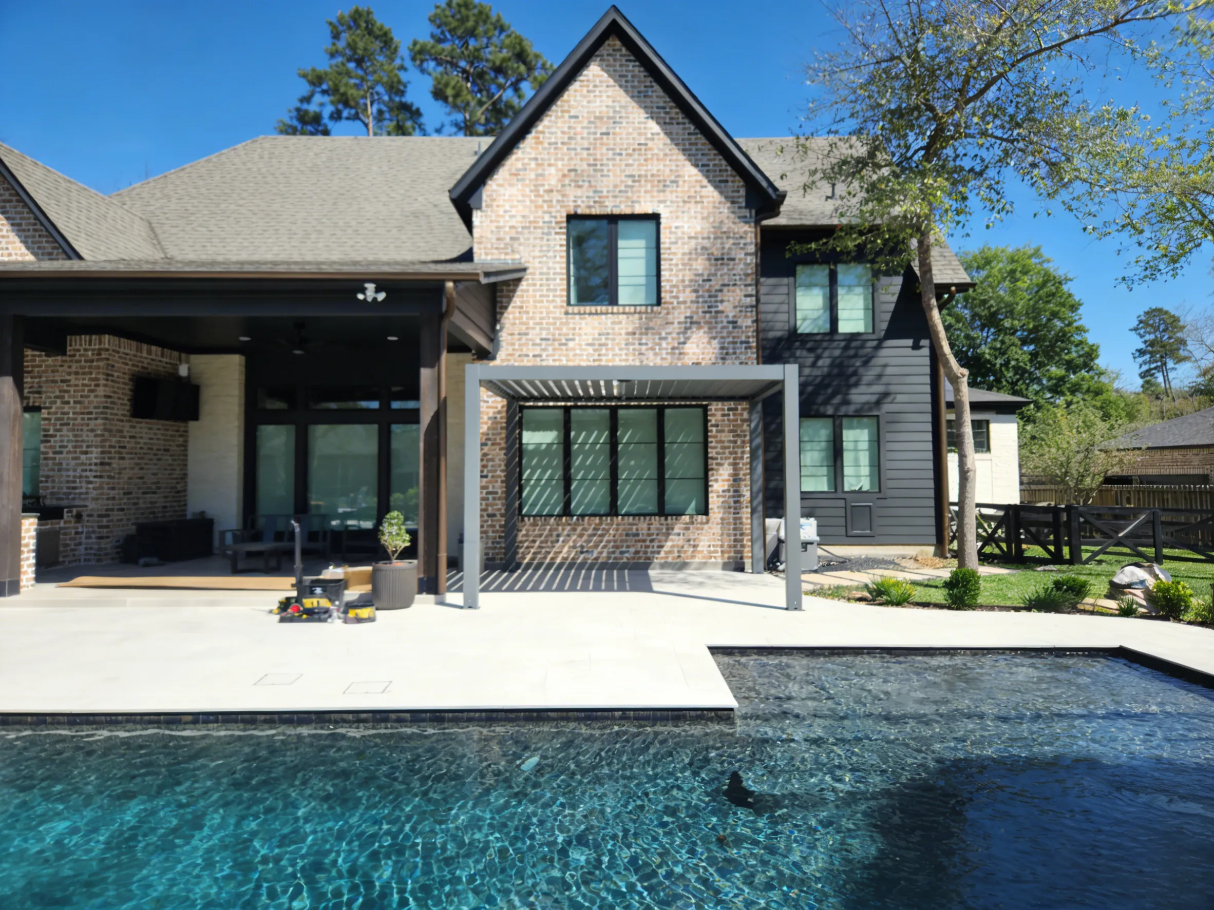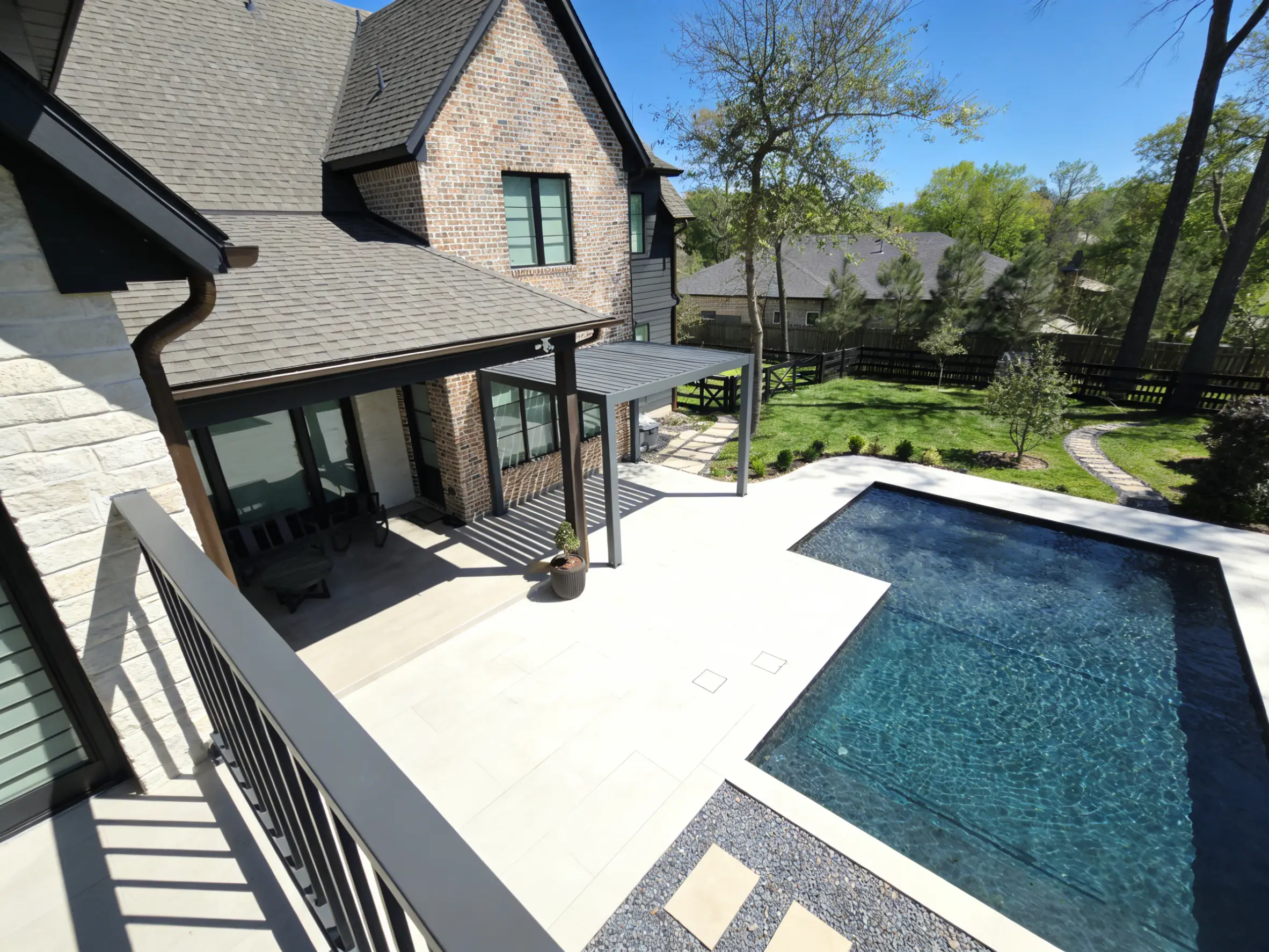 The pergola acts as a comfortable buffer zone, providing a shaded spot to rest before or after swimming, connecting the home’s living space to the pool area seamlessly.