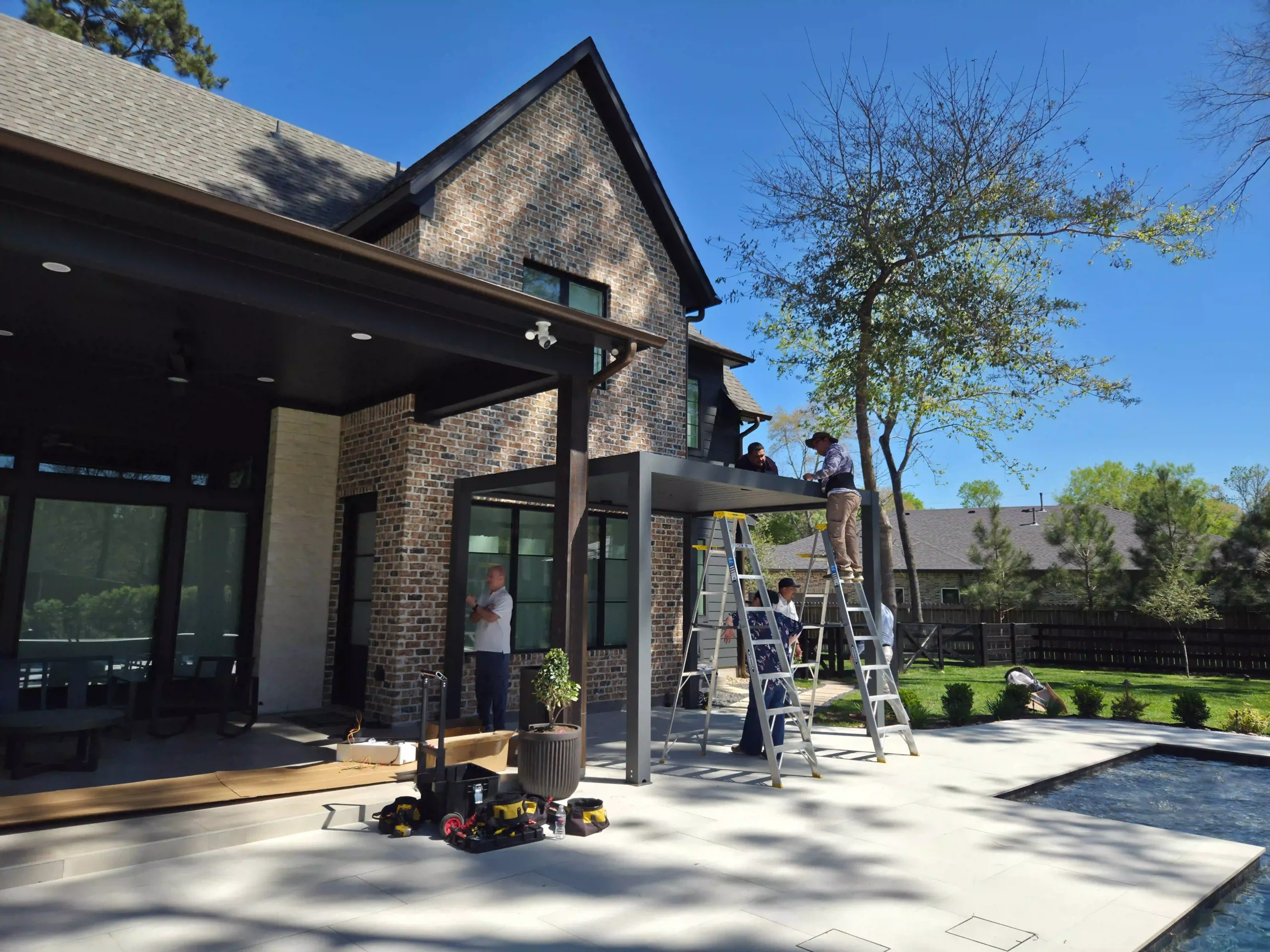 The Rangel family already had a fixed, attached patio roof extending their indoor living space, but they wanted a dedicated, separate area for gatherings, BBQs, and poolside relaxation. With no flexible, independent shade structure, their backyard lacked clear zoning, making it hard to host lively events without disrupting the quiet home space. We installed a custom 13×12 freestanding louvered pergola with a sleek gray frame and matching gray louvers. This independent structure creates a distinct social hub, acts as a seamless transition between the home and pool, and delivers fully adjustable shade for year-round comfort.