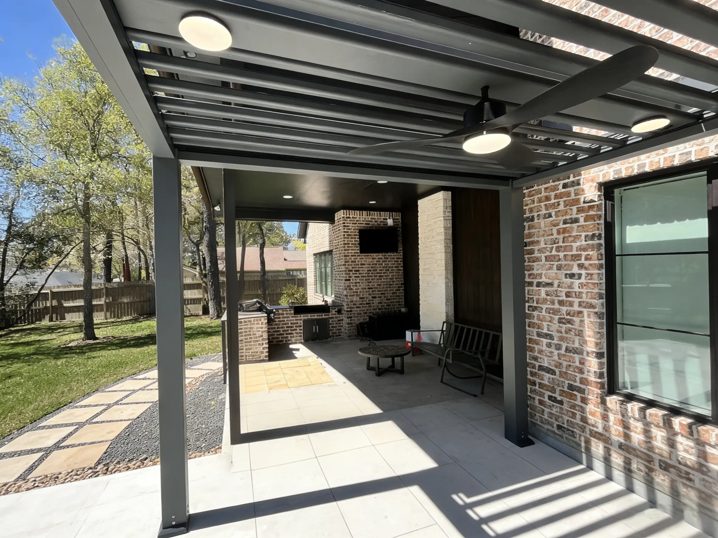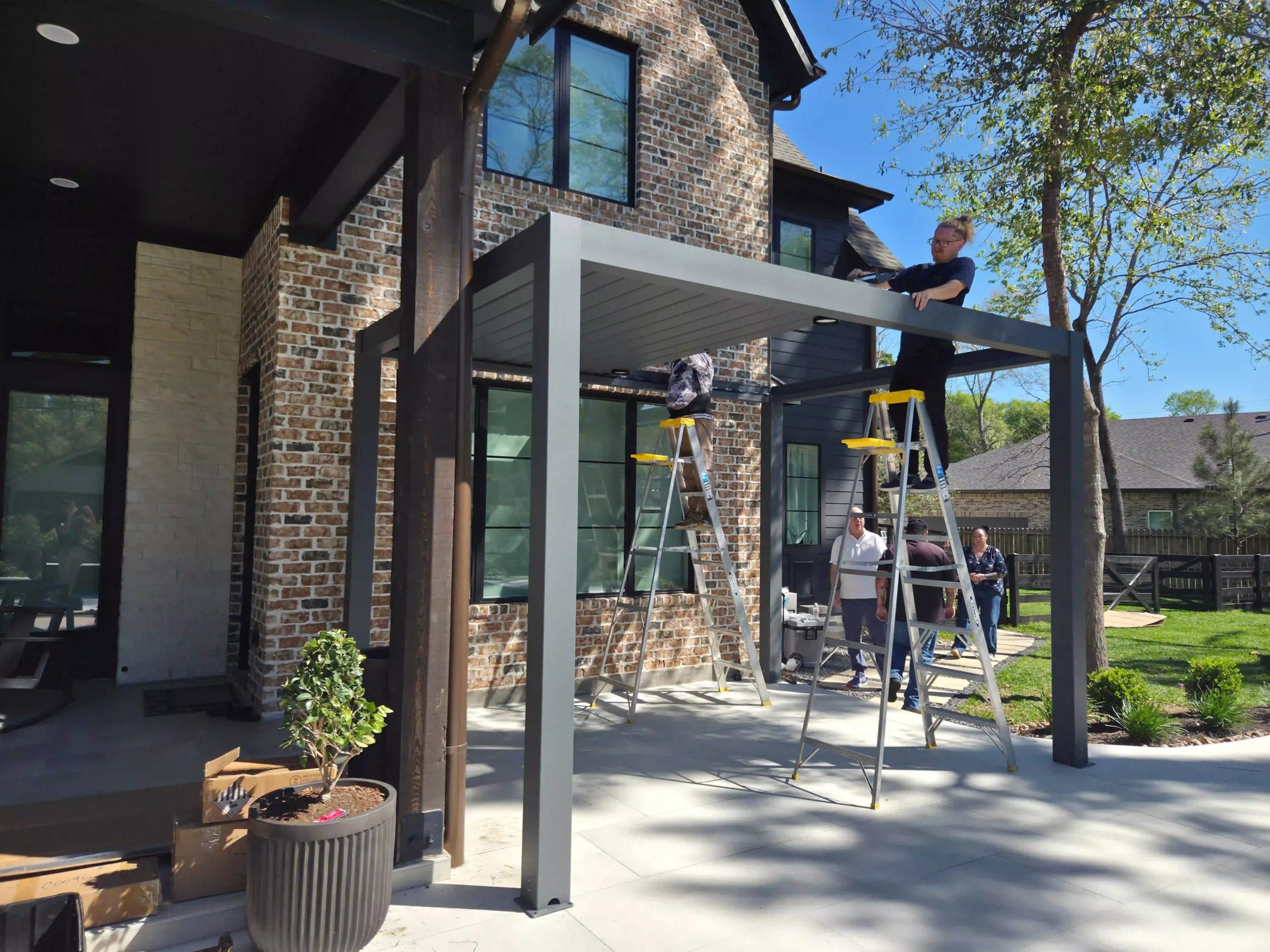 Home » Pergola Cases » 13x12 Gray Freestanding Louvered Pergola in Houston