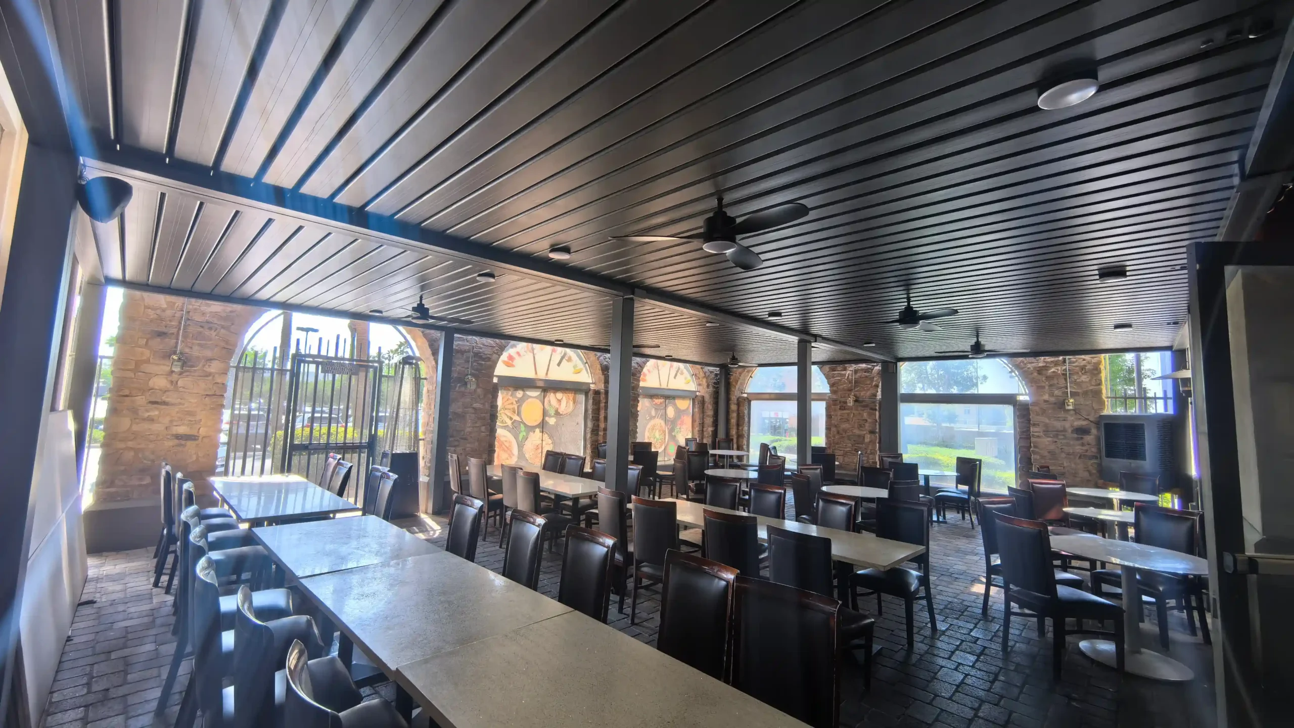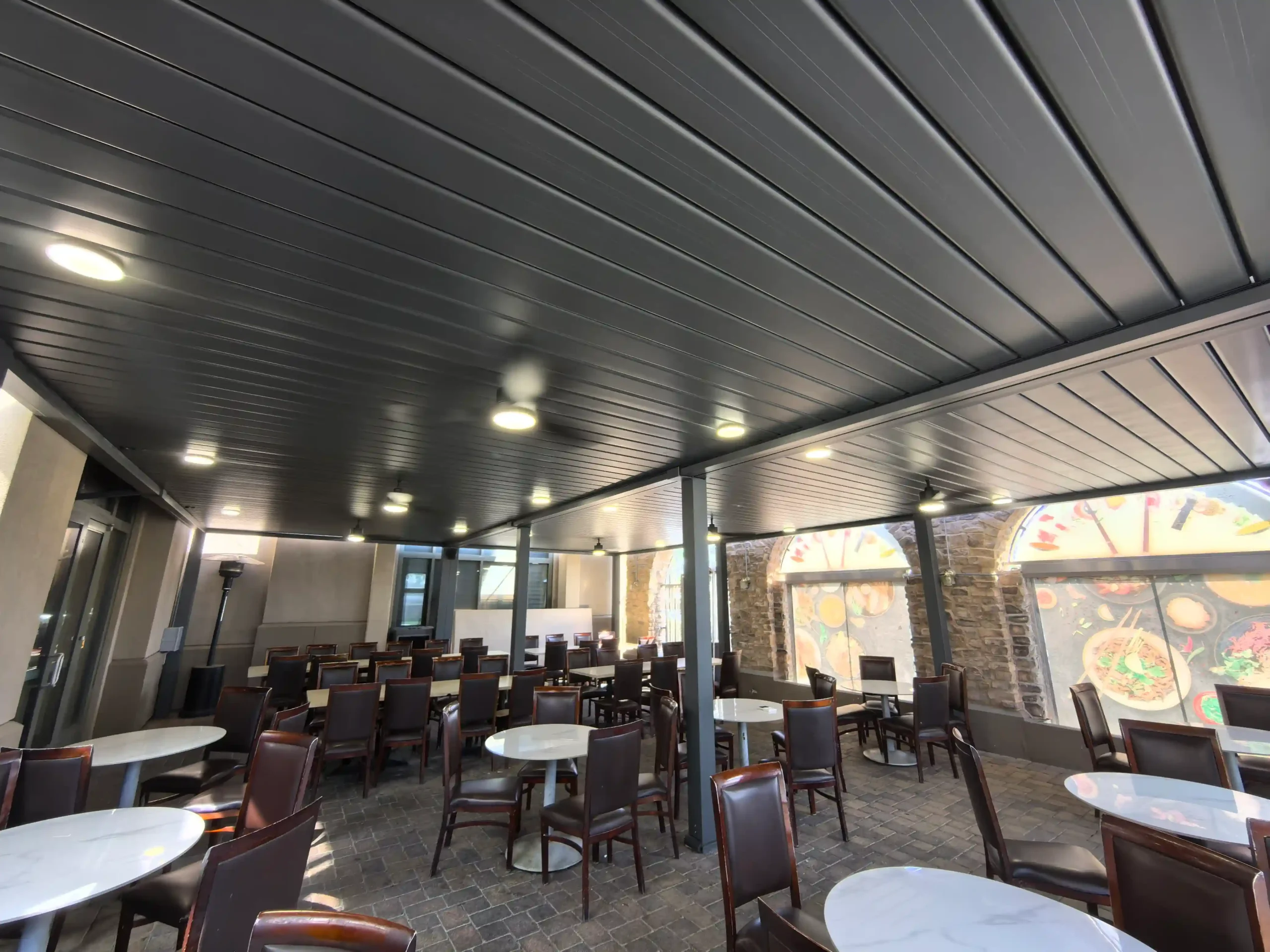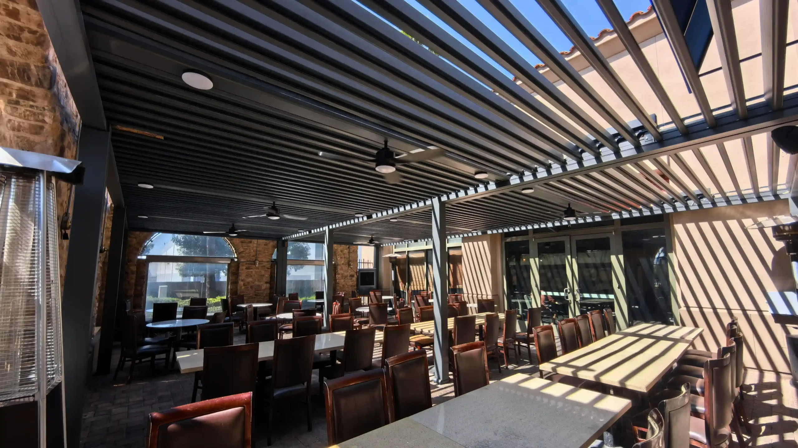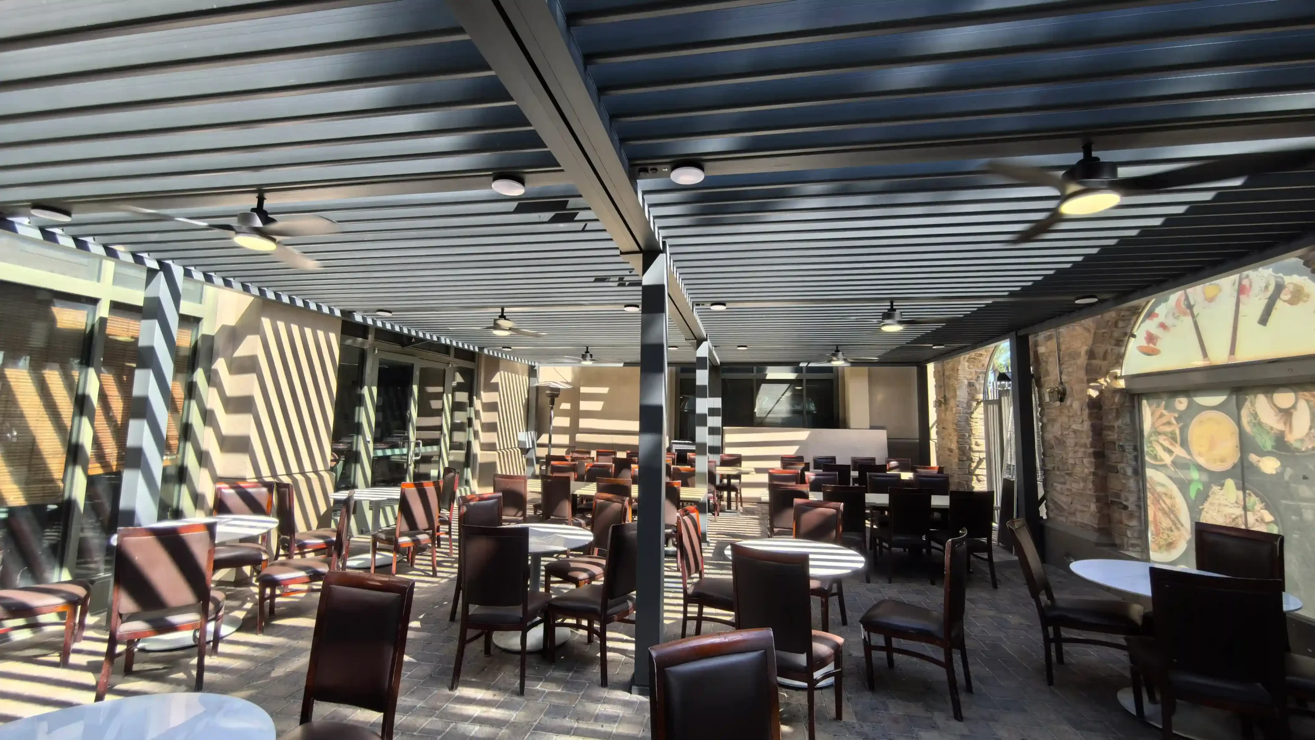 To address these, we installed four 10ft.×14ft. gray solar aluminum pergolas. These pergolas transform the patio into a versatile, all - weather dining area. Equipped with motorized adjustable louvers, built - in ceiling fans, they offer shade, rain protection, and a comfortable airflow. Now, the patio serves as a year - round gathering spot, elevating the restaurant’s curb appeal and turning a previously neglected area into a profit - driving, customer - favorite outdoor dining space, perfectly integrating with Buffet Star’s modern aesthetic.